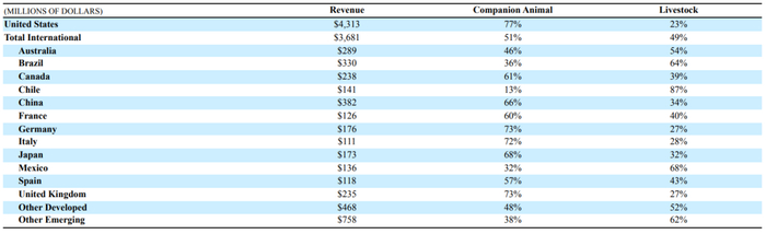 国际业务占公司总收入的46%,为36.81亿美元,同比增长1%。而在国际业务中,来自中国的收入高达3.82亿美元,是公司除美国之外的第二大市场。其中,国际业务伴侣动物产品收入为18.62亿美元,同比增长10%,主要来自于皮肤科产品销售额增长,还包括新推出的单抗产品Librela(bedinvetmab)和Solensia(frunevetmab),以及Simparica(沙罗拉纳)的增长;畜牧动物产品收入为18.19亿美元,同比减少7%,虽然针对鱼、羊、家禽和牛的产品销售额增加,但部分被针对猪的产品销售减少所抵消。