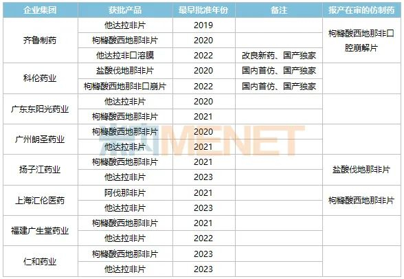 截至目前,已获批上市用于治疗ED的国产PDE5抑制剂超过50款(按产品名+企业集团统计),涉及40多家国内药企,其中齐鲁制药已获批3个产品,科伦药业、广东东阳光药业、广州朗圣药业等7家企业也有2个产品获批。