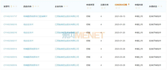 江西施美药业目前并未有用于治疗ED的PDE5抑制剂获批上市,目前公司提交了枸橼酸西地那非口腔崩解片、他达拉非片、枸橼酸西地那非片3个产品的仿制上市申请,有望成为国内抗ED药物市场的新黑马。