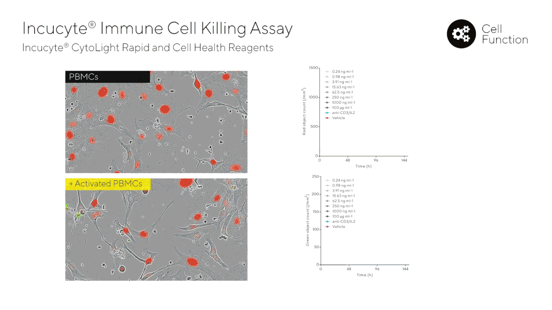 图2:使用Incucyte® 进行免疫细胞杀伤实验,细胞质快速标记染料及细胞健康试剂(非本文实验图像)