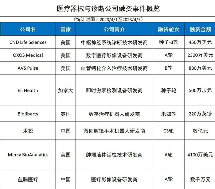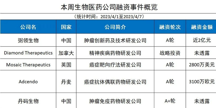 此外,本周(4月1日至4月7日)全球大健康领域共披露融资事件20起。在生物医药领域,开发抗癌疗法的公司获得融资数额最多。其中,致力于开发潜在“first-in-class”抗体偶联药物(ADC)的Adcendo公司完成3100万欧元的A轮扩展融资,将A轮融资总数提高到8200万欧元。该公司的主打在研ADC靶向名为uPARAP的创新靶点,它在肉瘤和间质癌的细胞表面高度表达。在临床前研究中,靶向uPARAP的ADC在多种肉瘤亚型中表现出治疗潜力。该公司计划为这款ADC开展广泛的临床开发项目。