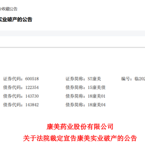 4月8日,康美药业发布公告,广东揭阳市中级人民法院作出《民事裁定书》,宣告康美实业投资控股有限公司(以下简称“康美实业”)破产。