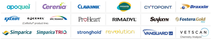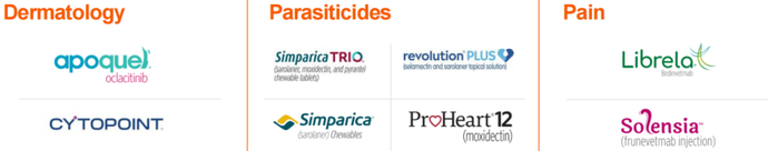 抗寄生虫药物:ProHeart(莫西菌素)是目前唯一获得FDA批准用于预防犬心丝虫病的注射剂,只需由兽医注射1针,即可获得1整年的保护力,该产品也可用于治疗钩虫感染。Revolution(大宠爱)主要活性成分为赛拉菌素,是一种针对宠物猫和狗的体外抗寄生虫药物,主要防止跳蚤、丝虫、耳螨等,还可控制蜱虫、蛔虫和钩虫等。RevolutionPlus的主要成分在赛拉菌素的基础上增加了沙罗拉纳,因此可在Revolution的基础上增加针对黑腿蜱、墨西哥湾沿岸蜱的防护以及额外的跳蚤控制。Stronghold主要活性成分是塞拉菌素,是一种针对猫和狗的体内抗寄生虫药物,可用于预防和治疗跳蚤、丝虫、耳螨、蛔虫、钩虫、虱子等。Simparica(欣宠克)主要成分为沙罗拉纳,可用于预防和治疗犬的跳蚤和蜱虫感染。SimparicaTrio(沙罗拉纳,莫西克汀和噻嘧啶咀嚼片)主要用于犬的肠道蛔虫、钩虫及心丝虫的预防,以及体表跳蚤和蜱虫的控制,是首个三重组合式犬抗寄生虫药物。