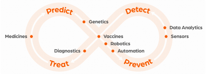 一系列的收购加上自研与积极的对外合作,硕腾逐渐成为动保领域全球领先的一体化解决方案提供者,在业务上形成了预测、预防、检测和治疗疾病的闭环。