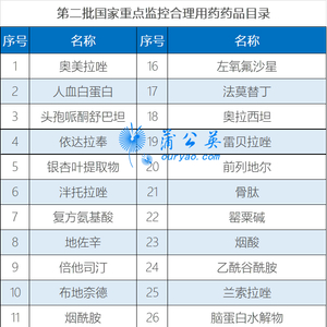 阿莫西林克拉维酸钾、脂溶性维生素、肌氨肽苷、复方骨肽、环磷腺苷、复方脑肽节苷脂、川芎嗪、丹参川芎嗪、胞磷胆碱、小牛血去蛋白提取物、二丁酰环磷腺苷、天麻素、左卡尼汀、奥扎格雷被2省纳入重点监控。