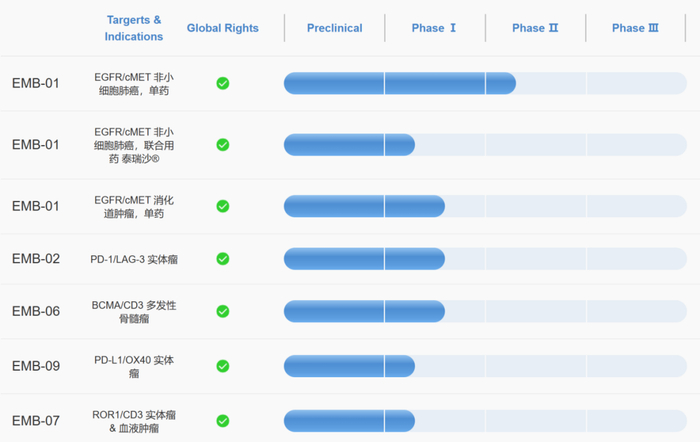 而MAT-Fab技术平台构建的首个双抗分子EMB-07(靶向 CD3 和 ROR1的双特异性抗体),I期临床的IND申报已在中国和澳大利亚获得批准。除5个临床阶段药物正在稳步推进以外,更多的临床前项目也即将进入临床。