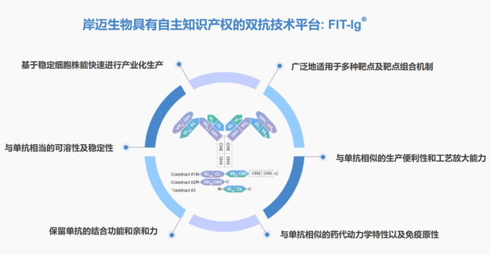 正所谓“单抗看靶点,双抗看平台”,对比单克隆抗体,双特异性抗体药物的开发有着极高的技术门槛。而致力于成为全球双抗领导者的岸迈生物赖以发展的核心优势就在于其自主开发的Fabs-in-tandem免疫球蛋白(FIT-Ig®)双抗技术平台。