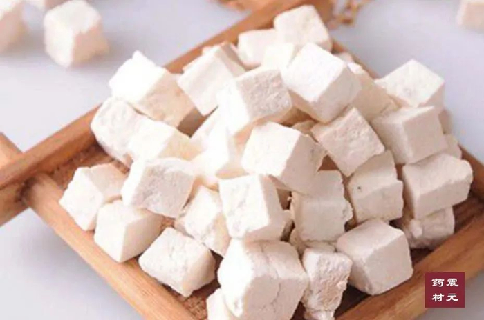正品茯苓块呈块片状,边缘整齐,白色,少数呈淡红色或淡棕色,质地坚实,断面颗粒性,有的具有裂隙。