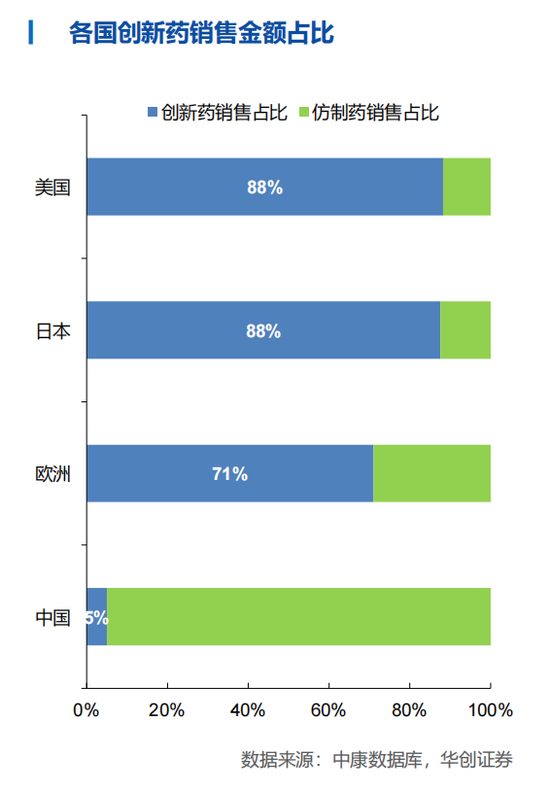 据华创医药统计,创新药(国产+进口)占国内药品市场比例约为5%左右,而同期美国日本创新药销售占比高达88%,国内创新药市场份额增长空间巨大。
