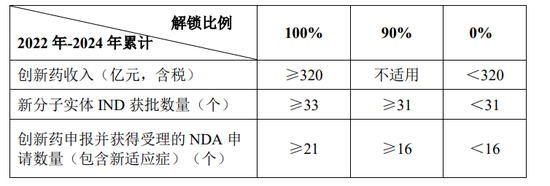 据恒瑞医药2022年8月发布的员工持股方案,激励股权从2022-2024年分三批次解锁,首批解锁条件之一为2022年公司创新药收入达到85亿元以上(含),及2023年创新药收入达到105亿元,2024年创新药收入达到130亿元。
