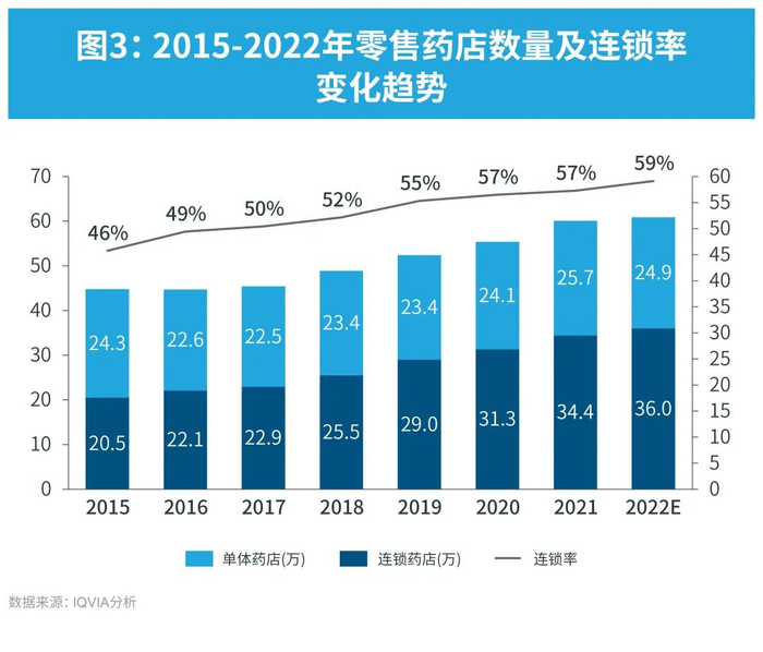 截至2022年10月,全国31个省、自治区和直辖市共有60.86万家零售药店。其中,连锁药店共有36万家,约占全国药店数量的59.15%,连锁率逐年提升,强者恒强。