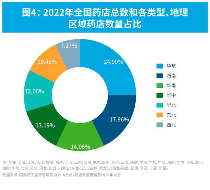 从地域分布来看,药店数量排名前三的区域-——华东、西南和华南地区药店总数达34.7万,占比接近57.02%,东北、西北区域排名靠后,拥有约10.8万家药店,仅占药店总数的17.73%。