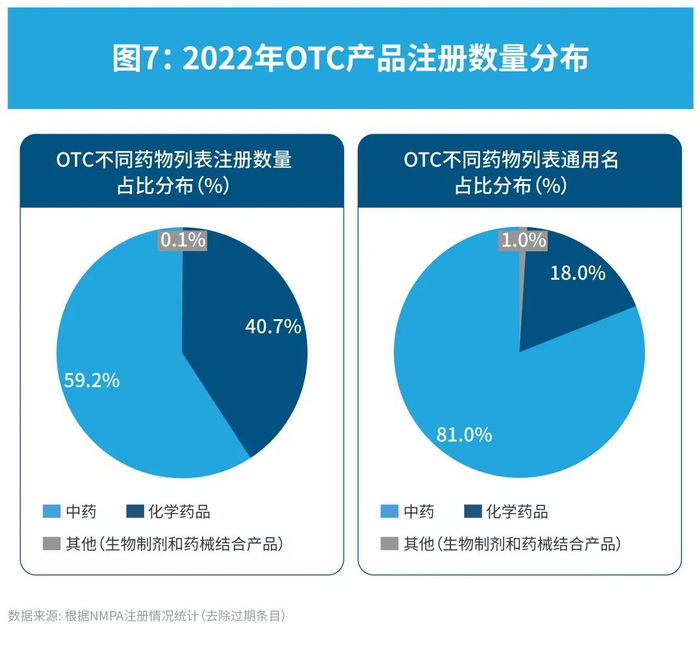 从OTC产品注册情况来看(*数据根据NMPA注册情况统计,并且去除其中的过期以及重复条目),截至2022年底,目前中国共有约5.4万个OTC注册产品,其中,中药占比略高于化药;按照通用名计算,约3.2千个OTC品种,其中,中药品种占比远超化药。