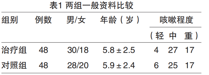 1.1一般资料 2010年3月-10月本院儿科门诊及病房收治的呼吸道感染( 其中包括气管支气管炎轻型肺炎 )患儿96例,均符合《实用儿科学》( 第七版)诊断标准,伴有中度以上咳嗽、咳痰症状。全部病例采用随机、对照、开放方法分为治疗组与对照组各48例,两组一般资料比较差异无统计学意义(P>0.05),具有可比性,见表1。