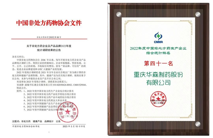 华森制药荣登2022 年度中国非处方药生产企业第41名