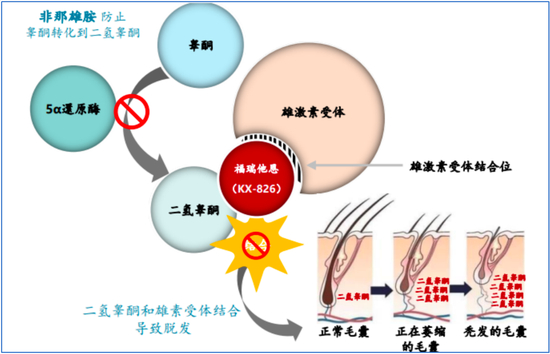 福瑞他恩(KX-826)是局部使用的药品,通过竞争雄激素与靶组织中的雄激素受体结合,从而局部阻断雄激素介导的信号传导。由于福瑞他恩采用不同的作用机制,仅与毛囊附近的雄激素受体结合,所以不会如使用非那雄胺一样衍生不良副作用。