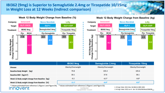 值得一提的是,IBI362在同类肥胖治疗药物中潜在效果最佳:连续给药12周,使用9mg IBI362的患者,与基线相比,体重减轻幅度大于2.4mg司美格鲁肽和15mg的替尔泊肽。