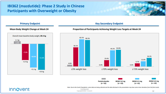 IBI362在2期临床试验中取得积极的数据结果:连续给药24周,与安慰剂相比,接受3mg的IBI362的受试者体重平均减轻了7.2%,4.5mg组平均减轻了10.6%,6mg组平均减轻了11.6%(相当于9.9kg)。此外,IBI362组分别有 58.1%(3mg)、82.5%(4.5 mg)和80.3%(6mg)的患者体重减轻了至少 5%,而安慰剂组仅为4.8%。