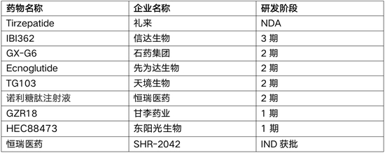 其中,在国产创新药中,信达生物IBI362研发进展最快,处于临床3期。同时也是国内乃至全球目前唯一一款进入肥胖和糖尿病注册研究的GLP-1/GCG双靶点的药物。