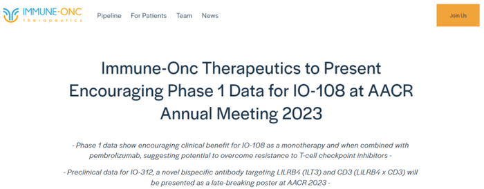4月15日,以明生物宣布,IO-108美国临床Ⅰ期剂量递增研究取得积极数据。这些数据将以口头报告形式,在4月18日于美国佛罗里达州奥兰多召开的2023年美国癌症研究协会(AACR)年会上公布。据悉,IO-108是一款创新髓系检查点抑制剂,靶向白细胞免疫球蛋白样受体B2(LILRB2,也称为ILT4)。