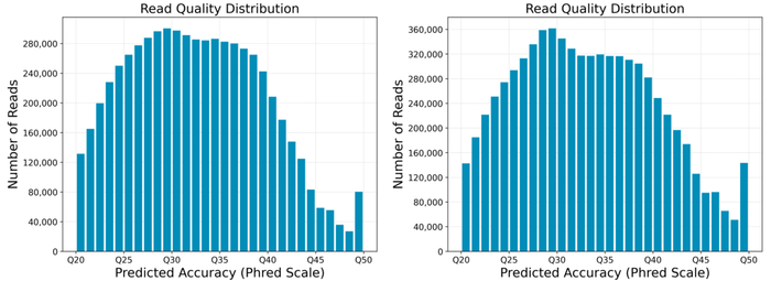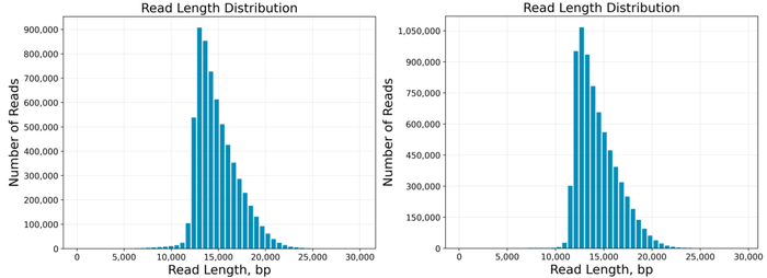 动物样本HiFi长度分布图(左), 植物样本HiFi长度分布图(右)