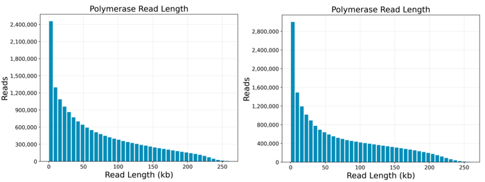 动物样本酶读长分布图(左),植物样本酶读长分布图(右)