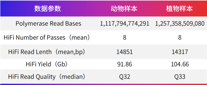 贝瑞基因Revio平台本次共测试2个样本,包括1个动物样本及1个植物样本,每个样本构建长度为15K的文库,单独上一个Cell。