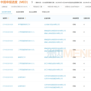 4月12日,CDE官网显示,山东鲁宁药业的苯甲酸阿格列汀片、湖南九典制药的维格列汀片等5款口服糖尿病用药同日报产获受理。在此之前,浙江华海药业的二甲双胍恩格列净片(Ⅴ)和二甲双胍恩格列净片(Ⅵ)、北京伟林恒昌医药|北京京丰制药集团的达格列净片也是近日报产,目前均在审评审批中。