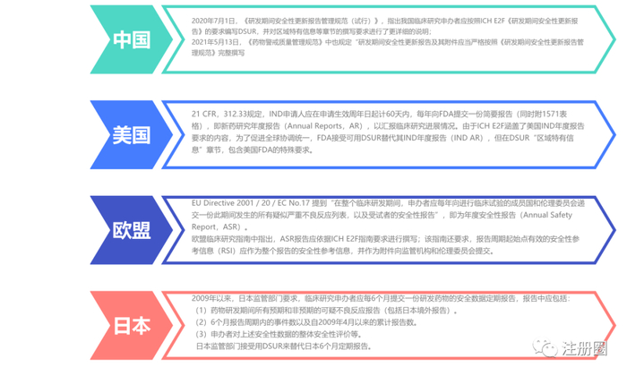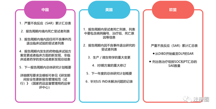 临床研究申请人应根据ICH E2F指南示例,并结合各区域特殊要求进行DSUR的撰写。下图总结出区域特有信息相关要求。