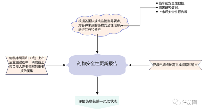 药物安全性更新报告是指根据各国法规或监管当局要求,对各种来源的药物安全性信息,包括临床前安全性数据、临床研究数据、上市后安全性报告等,进行汇总和分析,评估药物获益—风险状态,并按要求定期或按需完成撰写和递交的报告。
