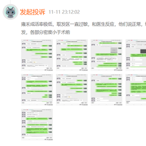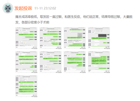 2021年11月,曾有消费者发起投诉,称“雍禾植发手术成活率极低,取发区一直过敏。医师团队对于该消费者的情况没有达成足够重视,在手术完成后,过敏导致大量脱发,各部分密度小于术前”。在此条投诉后,该消费者又追加投诉表示,“雍禾态度恶劣,并没有解决问题,尽管有检查报告,但依然不承认手术失败。”