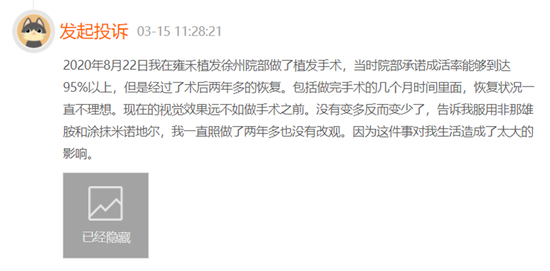 今年3月15日,也有消费者直言,自己曾于雍禾植发徐州分院做的植发手术,尽管经过术后两年多的恢复,依然不理想,视觉效果远不及手术前。该起植发手术对消费者本人生活造成了严重影响。