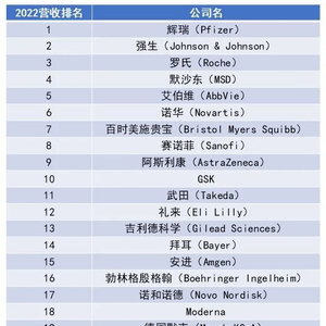 根据在2022年各大药企的营收,行业媒体Fierce Pharma于近日公布了全球前20大药企排名。在这份名单中,辉瑞、强生、罗氏位居前三。药明康德内容团队将为各位读者朋友们整理这些药企在2022年取得的进展,以及在近日所公布的研发成果。
