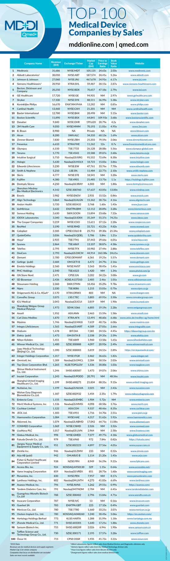 4月17日,医疗器械行业网站Medical Device+Diagnostic Industry(MD+DI)发布了2022年全球医疗器械企业TOP100榜单。