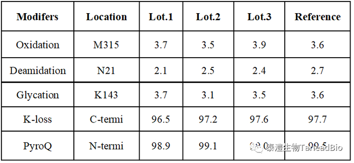 抗体分子在分泌、表达、纯化和贮存过程中,受细胞内和细胞外环境的影响,会发生翻译后修饰,常见的修饰有甲硫氨酸(Met)上的氧化(oxidation)、天冬酰胺(N)上的脱酰胺(deamidation)、N末端Q上的环化(pyroQ)和C末端丢失赖氨酸(K loss)等。这些修饰会引起抗体的局部构象和电荷发生变化,在IEF上表现出不同比例的酸碱峰。发生在CDR的修饰会影响活性,引起抗体药物治疗效果的下降。分析翻译后修饰和序列覆盖率的样本酶解方式相差不大,根据序列比对结果,计算翻译后修饰的位点和比例。翻译后修饰是酸碱峰表征和产品可比性研究中常见的检测项目。以某项目为例,在三批次产品的可比性研究中,对翻译后修饰进行表征,结果显示,三个批次产品和参比品之间的修饰类型和比例保持一致(表3)。值得注意的是,样本在处理过程中可能也会引入修饰,造成假阳性修饰,此时,可以使用低pH酶解条件等来降低样本处理引入的修饰。