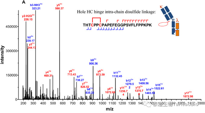 抗体的不同链之间通过二硫键链接,链内也有二硫键存在,以维持抗体的空间结构和活性。通常IgG1类型单抗有16个二硫键,双抗和多抗拥有更多的二硫键,重组蛋白的二硫键更错综复杂,链接形式也更加多样。二硫键链接方式直接和抗体的活性有关,错配会导致活性完全丧失,因此有必要利用质谱技术来表征样本的二硫键链接方式。样本在非还原状态下经过特异性酶切,在LC-MS上检测分析,利用串级数据,得到二硫键配对结果(图4)[3]。