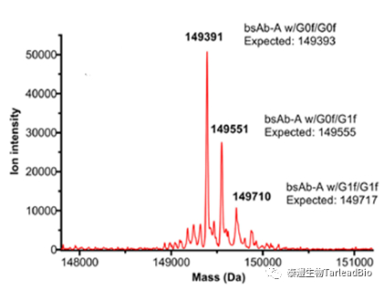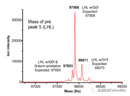 分子量分为完整分子量和还原分子量分子量,从整体来表征抗体分子,确认抗体分子是否有片段缺失、错配(图1)。对于双抗或其他多抗,目的分子和错配分子(如同源二聚体)之间的分子量相差不大,小到相差十几个Da,理化性质差别小,用常规的色谱方法无法区分双抗的错配情况,需要用液相色谱-串联质谱(LC-MS/MS)检测出的精确分子量来检测错配比例,指导早期CMC工艺的开发。此外,还可以用特异的N/O酶(PNGase FO-糖酶)切掉抗体上的N/O糖,消除糖型对分子量检测的影响,从而可以更准确的表征抗体分子特性。