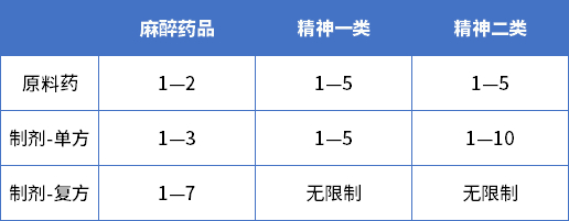 按2015年原食药监总局的规定,麻醉药品原料药同品种定点生产企业1-2家,麻醉药品单方制剂同品种生产企业1-3家,麻醉药品的复方制剂同品种1-7家;精神药品原料药同品种定点生产企业1-5家,第一类精神药品单方制剂同品种定点生产企业1-5家。