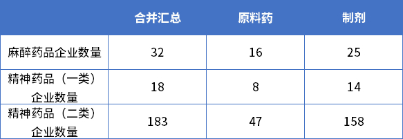 根据国家药监局统计年度报告显示,我国麻醉药品企业数量仅有32家,精神药品(一类)企业18家,精神药品(二类)企业183家,合并汇总加起来仅有233家。