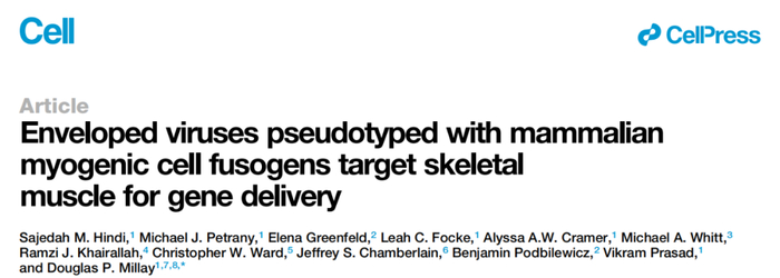 2023年4月18日,美国辛辛那提儿童医院医学中心的研究人员在 Cell 期刊发表题为:Envelopedviruses pseudotyped with mammalian myogenic cell fusogens target skeletalmuscle for gene delivery 的研究论文。