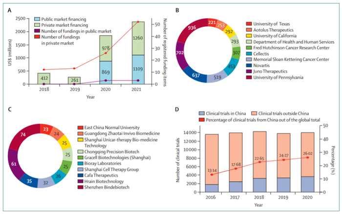 在充足的研究资金支持下,中国细胞治疗公司迅速发展,并在该领域发挥着重要作用。与美国相比,美国的研究机构申请了大部分专利,而中国十大CAR-T细胞相关专利申请人中,有九家是私营公司。