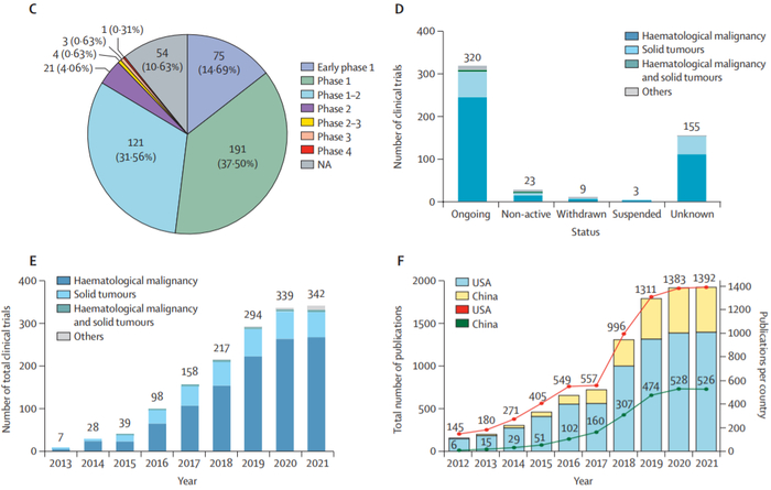 目前,进行CAR-T细胞治疗的研究中心主要集中在拥有先进基础设施的中国东部沿海经济城市,如北京(n=84)、广东(n=65)、浙江(n=65)、江苏(n=59)和上海(n=54)。320项涉及CAR-T细胞治疗的临床研究正在进行中,其中大多数(约70%)仍处于1期或1/2期。同时, CAR-T细胞相关研究论文也出现了平行增长。在某种程度上,高频率的发表与试验比率反映了参与CAR-T细胞研究的中国医生和科学家在临床转化方面所做的努力。