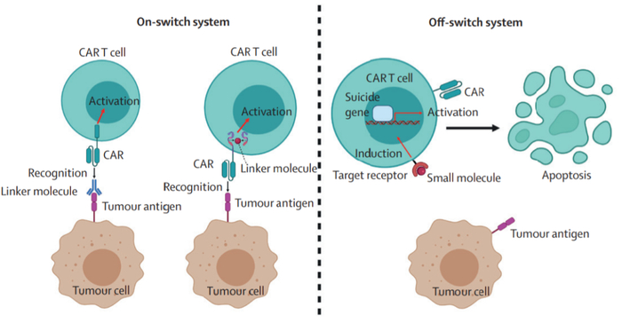 尽管CAR-T细胞疗法在血液学恶性肿瘤的疗效方面取得了突破,但严重的副作用阻碍了其广泛发展。为了减少这些不良反应,研究人员提出了各种安全策略。安全开关的CAR-T细胞旨在通过抗体或小分子药物抑制过度激活,从而避免严重的副作用。引入诱导性自杀基因是另一种提高安全性的常见策略,例如编码单纯疱疹病毒胸苷激酶、截短的表皮生长因子受体、诱导性Caspase9(iCasp9)和RQR8的CAR。此外,研究人员根据合成生物学原理设计了含有不同抗原识别模式受体结构的CAR-T细胞,如合成Notch受体、抑制性CAR和基于亮氨酸拉链的通用CAR。
