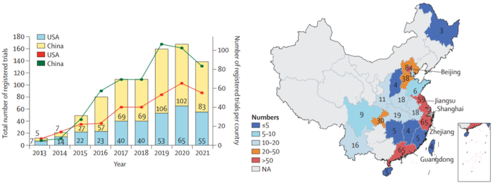 截至2021 11月15日,中国已注册了714项CAR-T细胞治疗临床研究,其中510项临床试验在ClinicalTrials.gov上注册,204项在中国临床试验注册中心。