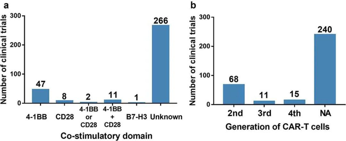 在中国注册的试验都没有使用第一代CAR,相比之下,第二代CAR是目前最受欢迎的选择,其次是新颖的第四代(4SCARs)和第三代。最常见的共刺激域是4-1BB,其次是CD28和4-1BB的组合。