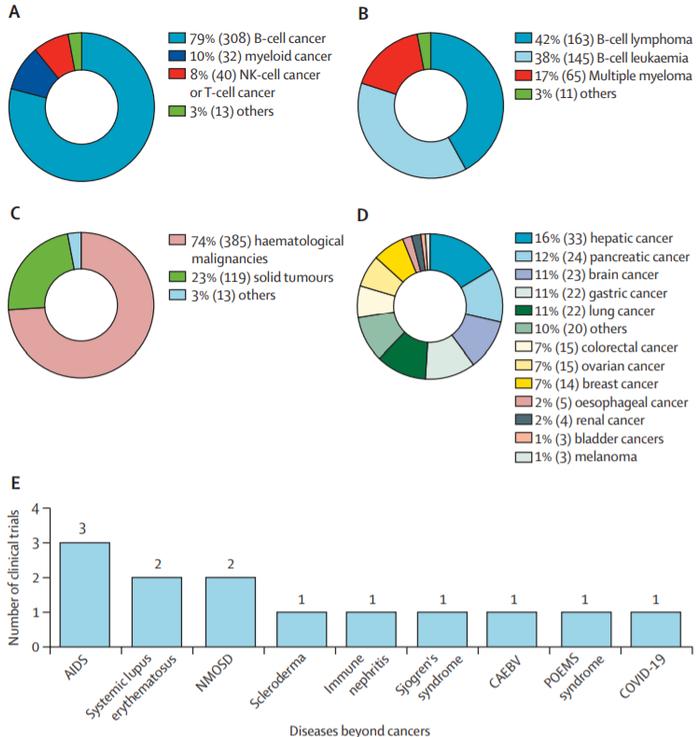 此外,中国的研究人员一直在积极扩展CAR-T细胞的适用临床背景,342项试验中有13项(3%)登记了肿瘤以外的疾病,119项(23%)登记了实体瘤。CAR-T细胞疗法中最常试验的实体肿瘤包括肝癌、胰腺癌和脑癌,而非恶性疾病涵盖范围更广,包括自身免疫性疾病、传染病和POEMS综合征。具体而言,针对自身免疫性疾病的CAR-T细胞试验包括系统性红斑狼疮、硬皮病、肾炎、干燥综合征、视神经脊髓炎谱系障碍,以及针对感染性疾病的CAR-T细胞试验,包括艾滋病、慢性活动性EB病毒感染和新冠肺炎。