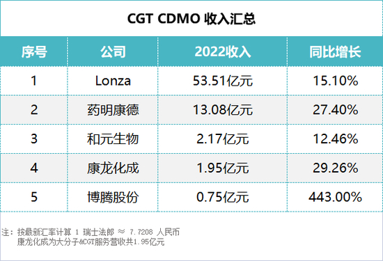 2022年CGT CDMO营收盘点:Lonza、药明、和元、康龙、博腾