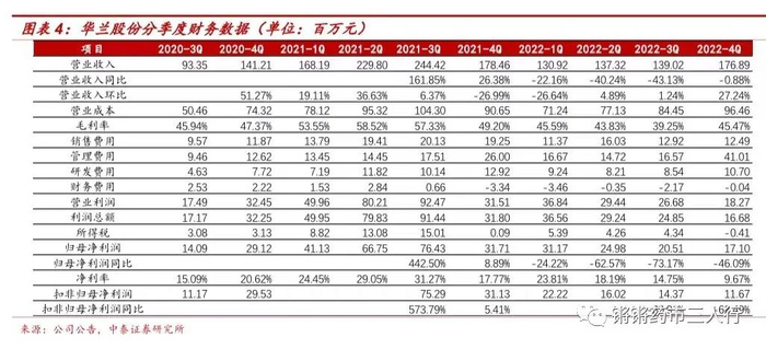 ■费用率:2022、22Q4销售费用率9.04%(+0.20pp)、7.06%(-3.73pp),管理费用率15.23%(+6.53pp)、23.18%(+8.62pp),财务费用率-1.03%(-1.24pp)、-0.02%(+1.85pp),管理费用率变动主要因为公司为实施数字华兰灯塔工厂顶层规划项目致使当期咨询费及服务费大幅增加。