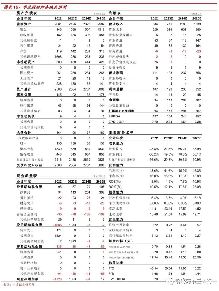 ■ 费用率:收入、产品结构影响毛利率,费用率上升,研发投入减少。毛利率:2022、22Q4毛利率分别为43.63%(-11.49pp)、45.47%(-3.74pp)。毛利率下降主要因为收入下降、产品结构的影响。费用率:2022、22Q4销售费用率9.04%(+0.20pp)、7.06%(-3.73pp),管理费用率15.23%(+6.53pp)、23.18%(+8.62pp),财务费用率-1.03%(-1.24pp)、-0.02%(+1.85pp),管理费用率变动主要因为公司为实施数字华兰灯塔工厂顶层规划项目致使当期咨询费及服务费大幅增加。研发投入:2022、22Q4研发费用3669万元(-12.81%)、1070万元(-17.22%),占收入比例6.28%(+1.15pp)、6.05%(-1.19pp)。研发费用减少主要因为2022年研发结题的项目较多,新立项的项目前期研发材料投入较少。