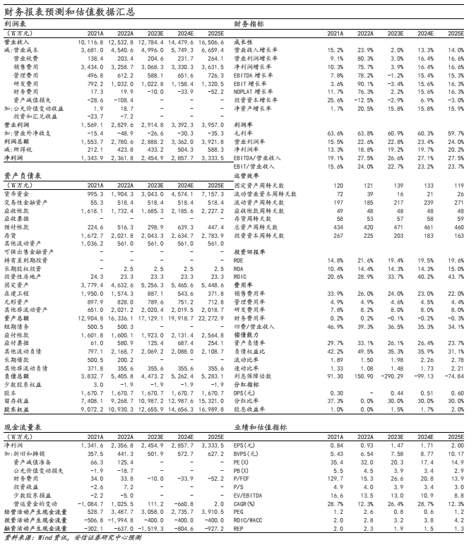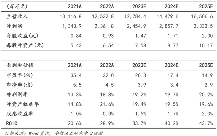 我们预计公司2023年-2025年的营业收入分别为127.84亿元、144.80亿元、165.07亿元,归母净利润分别为24.55亿元、28.58亿元、33.34亿元,对应的PE估值水平分别为20.3倍、17.4倍、14.9倍,6个月目标价36.75元,对应2023年25倍PE,给予买入-A的投资评级。
